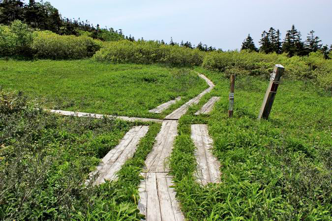 | 階段を登りつめてしばらく行くと樹林も途切れて明るく開けたヒバクラ湿原に飛び出します。 |