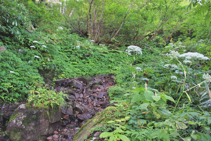 | 蓮華の森から少し行くと道には沢のように水が流れていて、まわりには白い花が沢山咲いていた。 |