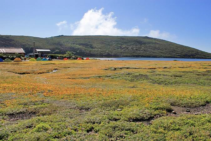 | 白馬大池の周りは明るく何となく華やかな雰囲気で、テントの数も結構多い。 |