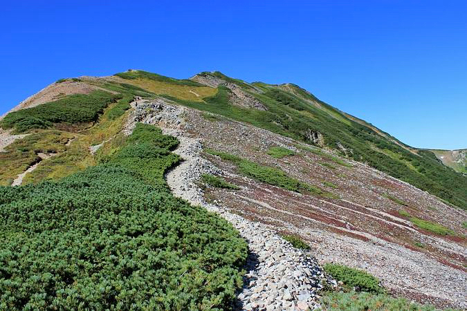 | 稜線直下から小蓮華山を見る。中央の人が立っているピークは船越ノ頭。 エンド・クレジットの後半で流れる映像に何となく似ています。左の道を少し行くと稜線に出ます。 (画像をクリックすると拡大されます) |