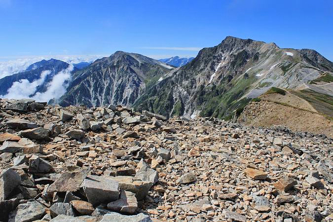| 小蓮華山から白馬岳まで続く岩礫の道。 場所や季節柄、植物もあまりなくわずかにトウヤクリンドウが見られた程度だった。 |