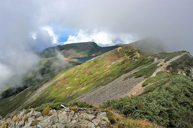 | 白馬岳からの下りは雲に覆われて眺めはなし。小蓮華山の手前でようやく雲が切れました。 途中では多くの登山者とすれ違った。小屋泊りの方が多いのだろう。 |