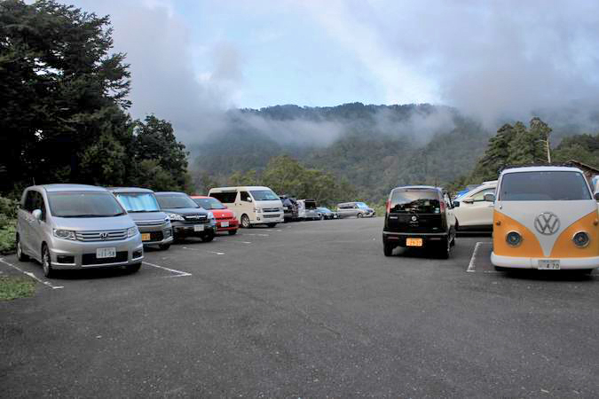 | 早朝の蓮華温泉駐車場。白馬岳はやはり人気の山で、駐車場は7割くらい塞がった状態だった。 簡単に腹ごしらえをしてから登山口に向かう。遠くに雪倉岳が見えている。 |