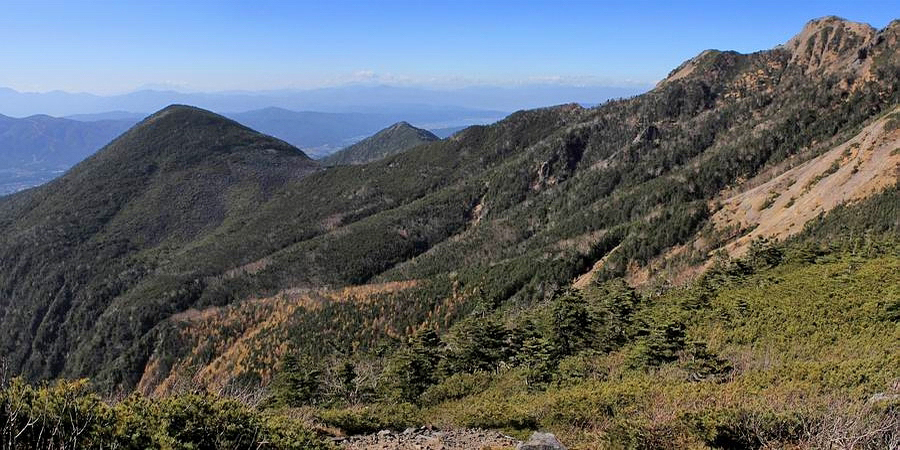 | 標高2300mあたりで突然樹林が切れて展望が広がる。 南アルプスの仙丈、甲斐駒、北岳、鳳凰三山などの山々が見えます。 |