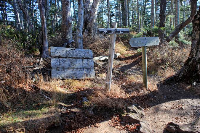 | ヘリポート跡から1時間ほど下り続けて、午後3時40分にようやく観音平方面への分岐点に着きました。 |