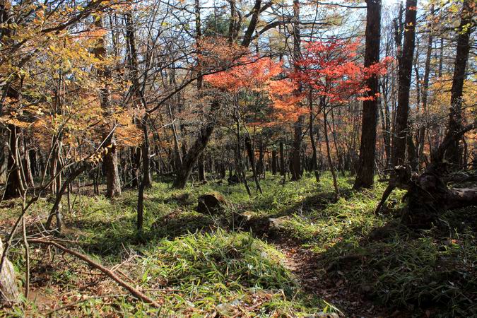 | ヘリポート跡を過ぎると道は笹原の中をゆっくりと下って行き、 やがて回りに紅葉が見られるようになってきます。 |