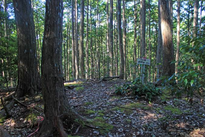 | 取り付きの急登が一段落してホッと一息つきながら登って行くと、 前方に案内板のようなものが見えてきました。 |