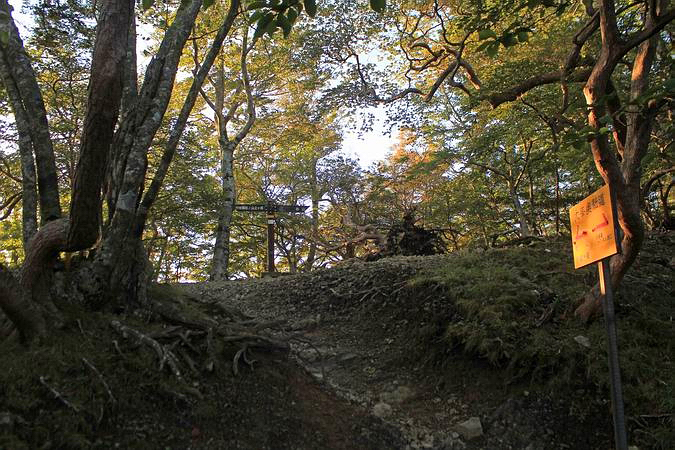 | 登り続けること1時間。 午前6時20分に奥駈道のある稜線に到着です。 |
