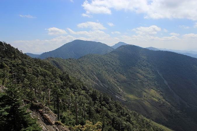 | 休憩したところから少し下ると左に八経ヶ岳が見えました。 山頂部は見えていない。 |
