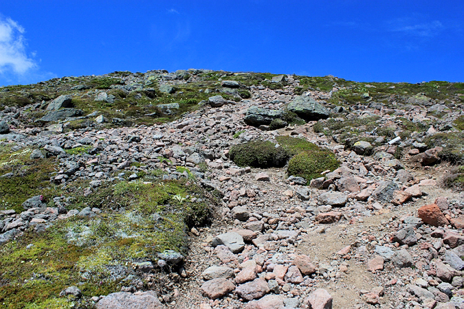 | 午前11時20分に北海道第二の高峰から下山開始です。 下りは浮石に足を取られないように・・・。 |