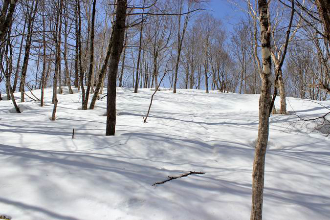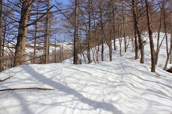 | 雪は硬く締まっており大変歩きやすい。 一応アイゼンは持ってきたが、出来ればつけたくないので取り敢えずこのまま行きます。 |