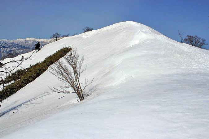 | 猪臥山を振り返る。まさに残雪の山の風景です。 ツボ足でももぐり込むことはなく快適な稜線歩き。 |