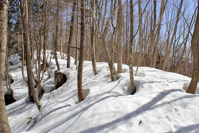 | 40分ほどで渡渉地点に着く。 沢はまだ雪に覆われていたが、踏み抜きがあるかもしれないのでジャンプして対岸に移ります。 |