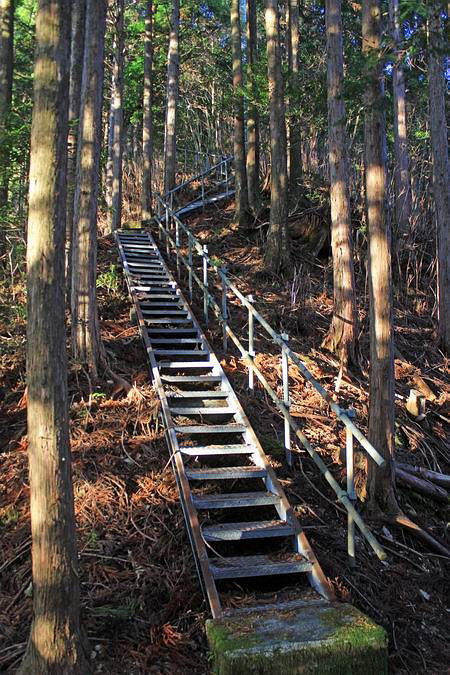 | 補給路入口の階段。ここまで来れば安心です。 奥駈道の保全に尽力されている新宮山彦ぐるーぷの皆様に感謝です。 あとは1.2kmの林道歩き。 |