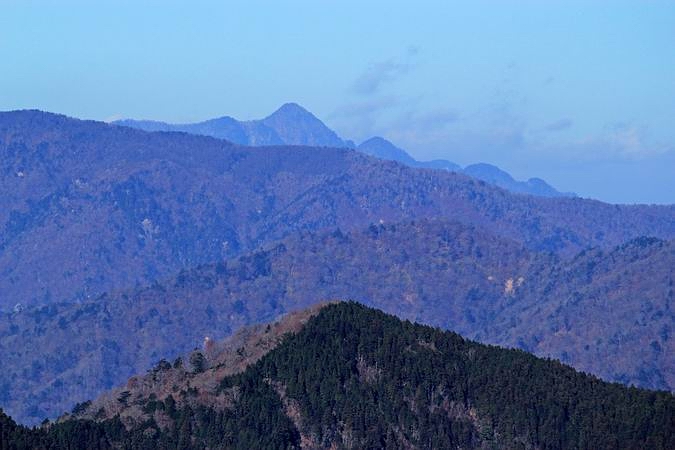 | 登りやすい鋼製の階段に助けられて登ること40分ほどで展望が開けるところがありました。 正面に大峯奥駈道上の転法輪岳と思われる山が見えます。 |