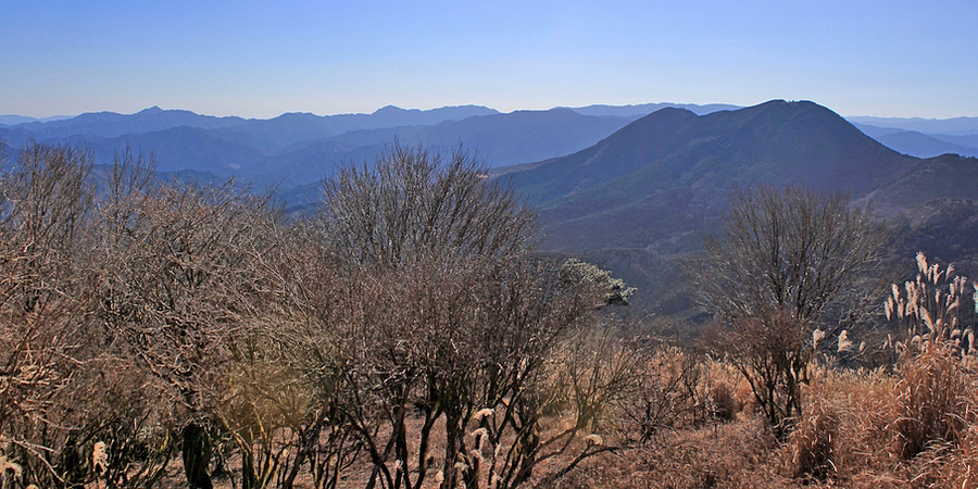 | そのあとは最後の大展望を楽しむ、と言いたいが、既に大洞山で見た眺めと大差はない。 目の前に見える大洞山の眺めが唯一新鮮なものでした。 背後は局ヶ岳から三峰山にかけての山々です。 |