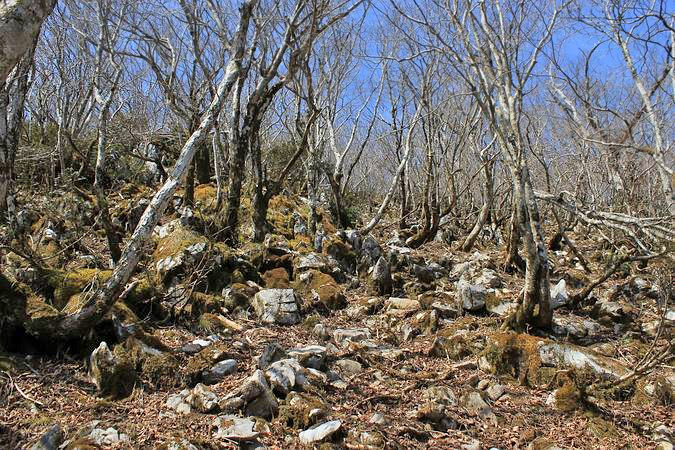 | 樹林帯を抜けると石灰岩に覆われた斜面の急登が続く。 迷い尾根から藤原岳に登った時と同じような感じです。 |