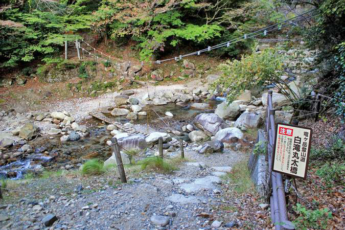 | 竜の雫を見たあと、遠足尾根の分岐を過ぎるとほどなく沢に出て白滝丸太橋を渡る。 多くの登山者は遠足尾根を登るようで、こちらに来る人は少ない。 |