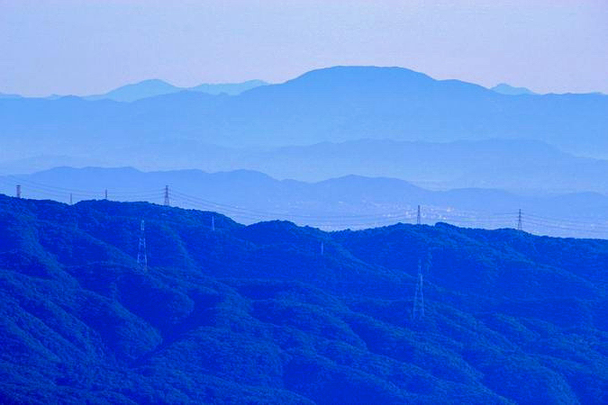 | 最後に名古屋市街の彼方の山々。 中央の丸いピークの右に見える山影は富士山。 |