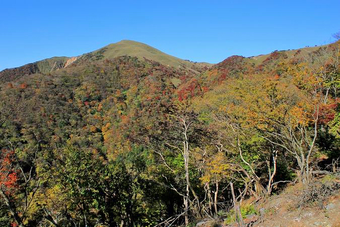| P1053の高まりを越えると竜ヶ岳が迫ってきます。 シロヤシオの紅葉はこのあたりから見られるようになる。 |