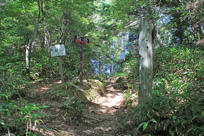 | 主稜線を少し登ると分水嶺です。 ここで道は稜線の道(冬道)と稜線を巻く道(夏道)に分かれます。私は眺めの良い稜線を行きます。 |