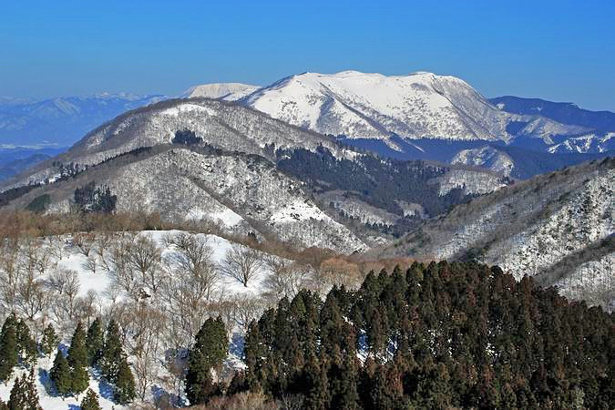 | 鈴鹿北部の雄、霊仙山。左奥に伊吹山、左手前に鍋尻山。 鍋尻山にはここから行くこともできるようです。行くなら福寿草の季節です。 |