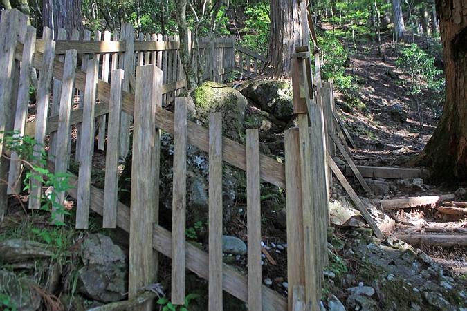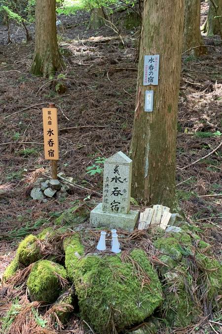 | 奥駈道に戻って少し行くと古の道しるべがありました。 ここで少し休みます。 |