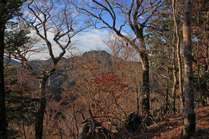 | 中央左下の稜線に持経千年桧の先の展望が開けたところが確認されます。 持経ノ宿はその先の森の中。そこから盛り上がる山が阿須迦利岳でその左奥に証誠無漏岳、 右に一旦下って盛り返したピークが涅槃岳、その右後ろ(釈迦ヶ岳の手前)が地蔵岳。 |