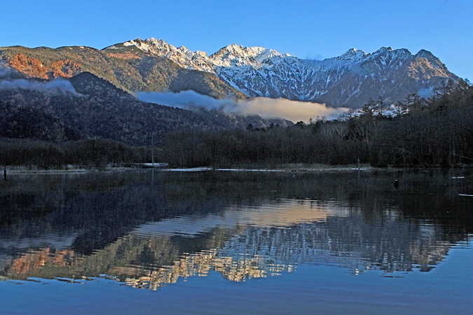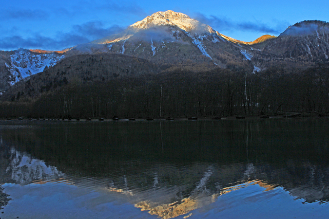 | 大正池からの穂高連峰。大正池から眺めるのは初めてです。 風があるため逆さ穂高は乱れている。 |