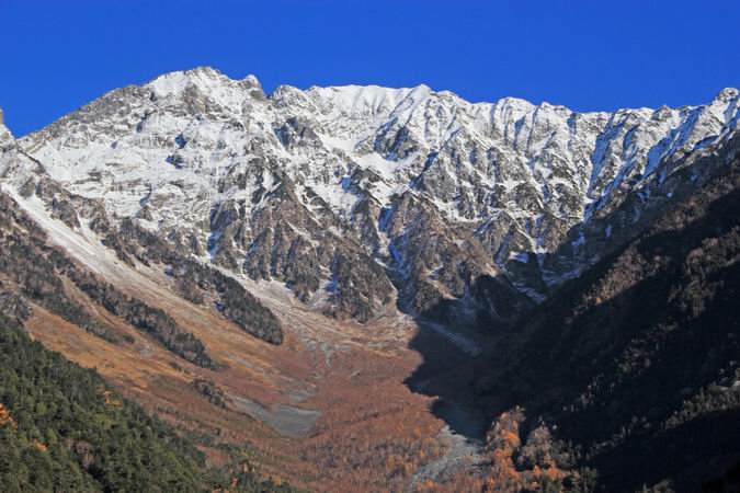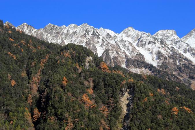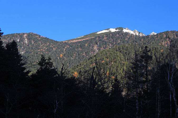 | 徳本口から河童橋に向かう途中で西穂高岳を眺める。 |