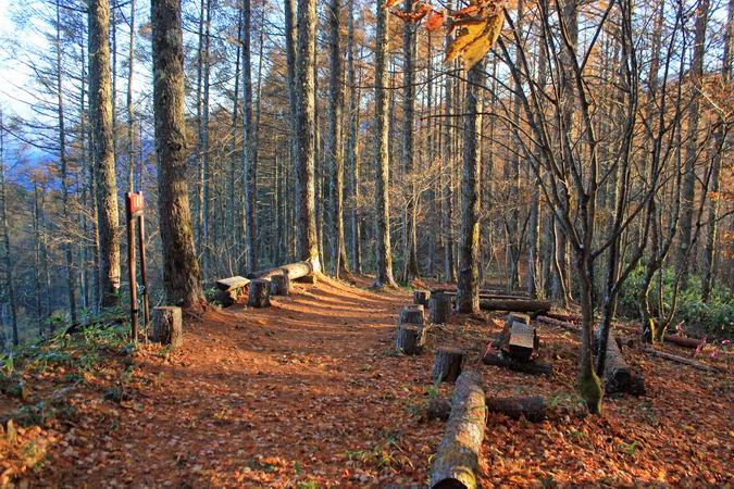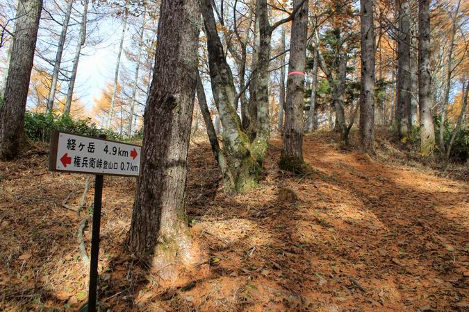 | 権兵衛峠登山口の駐車場には午前8時30分ごろに到着した。先着の車は2台のみで思ったよりも少ない。 すぐに支度をして駐車場を午前8時50分に出発。 |