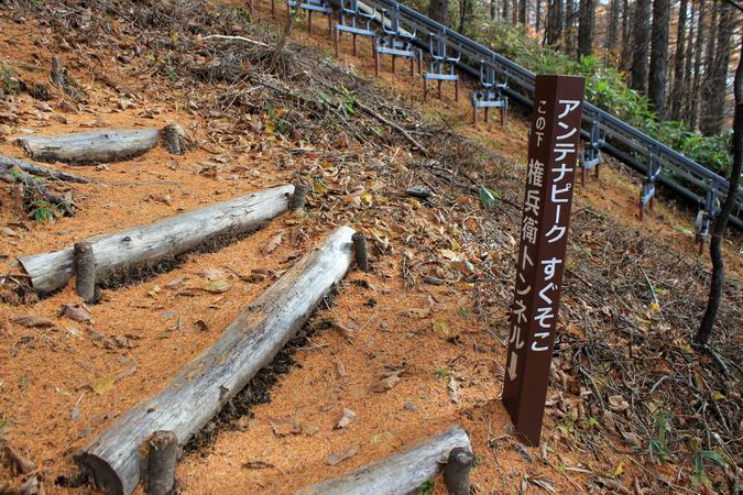 | ピークに近づくと斜面の勾配もきつくなりつづら折りの道となる。 権兵衛トンネルの上を通過。 |