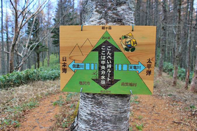 | そのあと”まっくん岩”や”観音岩”を過ぎて進んで行くと、P1884付近に中央分水嶺の案内板がありました。 信濃川は、茶臼山を源流とする奈良井川が槍ヶ岳を源流とする梓川と合流して犀川となり、 さらに千曲川となったあとの名称です。まさに大河です。 |