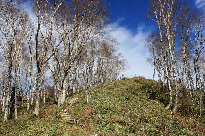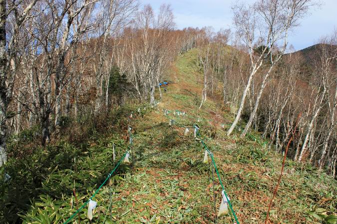 | コイノコの手前の小ピーク、アヤメ山。 作業をしているのは地元の方のようで、笹狩りをされていました。大事に環境保護・整備をされているようです。 |