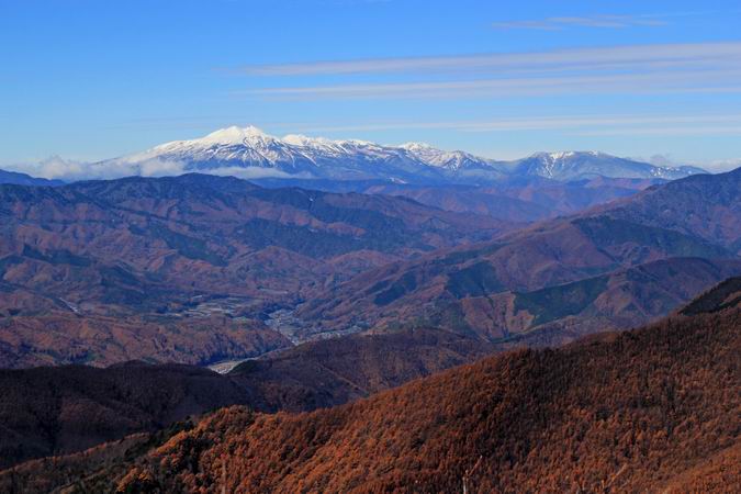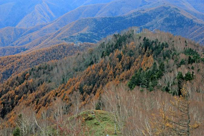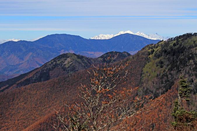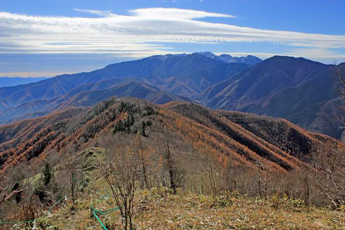| 南に中央アルプスの大観が見えました。 手前の黄葉した尾根はアンテナピーク(左端)から辿って来た尾根。 |
