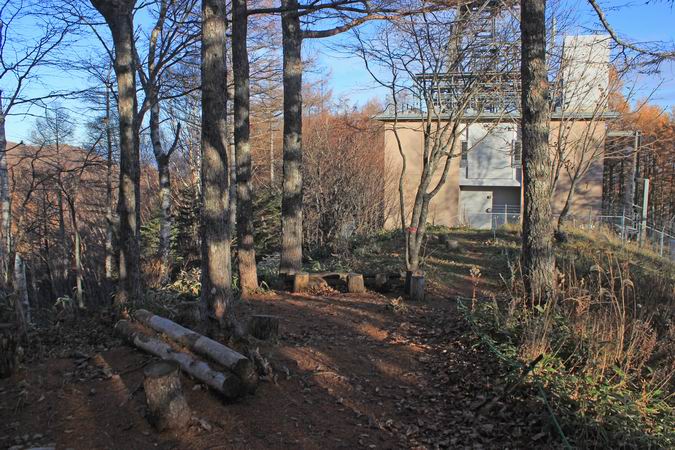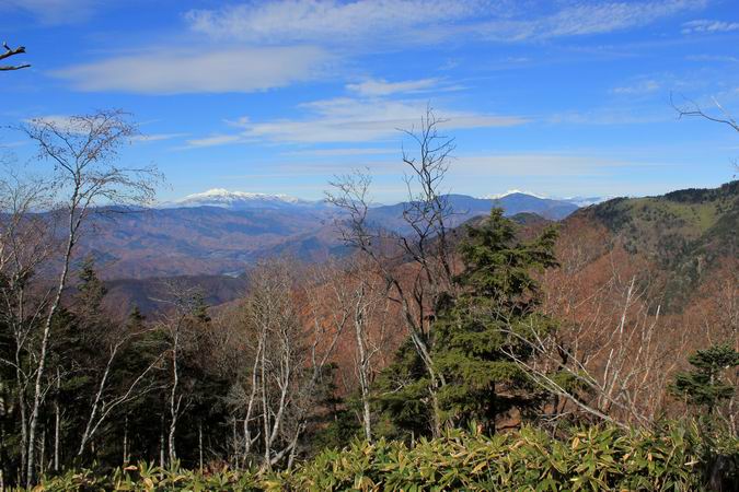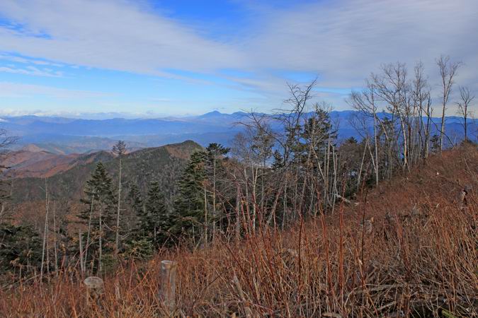 | 周囲の木々に遮られて展望は今一つです。 遠くに八ヶ岳が見えます。北横岳と蓼科山を繋ぐ予定だったが、来年を期すことにしよう。 |