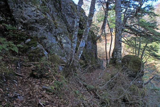 | 展望地から急降下して岩場まで来ました。 特に危険はないが、狭い道に岩が張り出していたので、岩を抱きかかえながら通過しました。 |