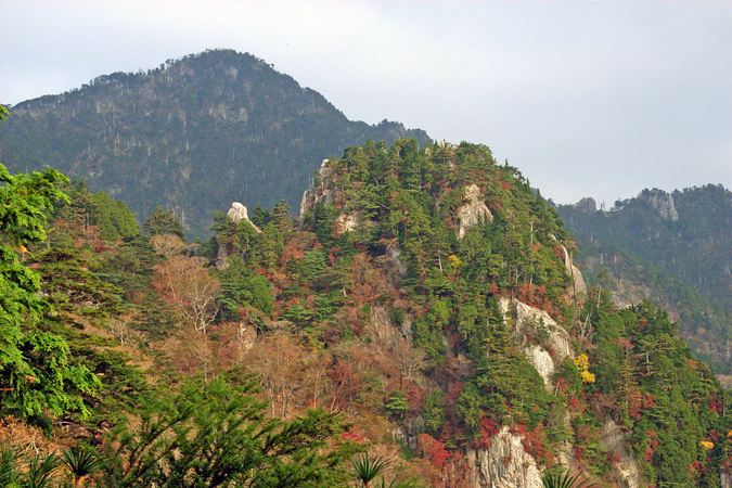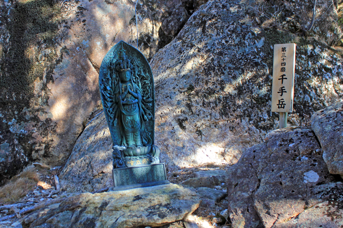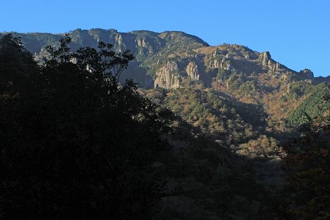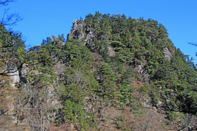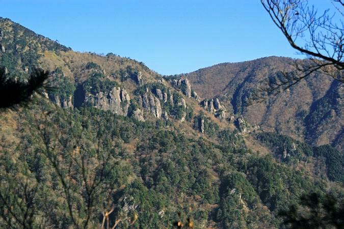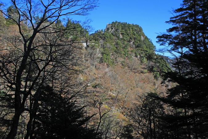 | 千手岳を拡大。 千手観音像は台形の山頂部の左の岩峰の基部にあるようです。 |