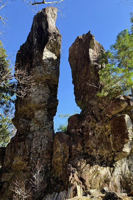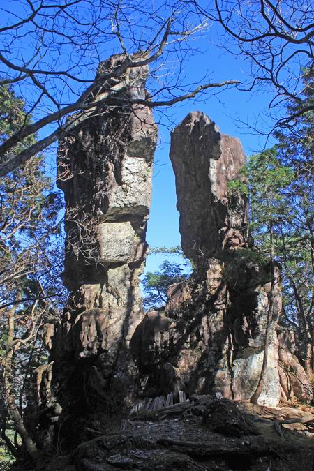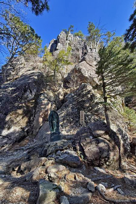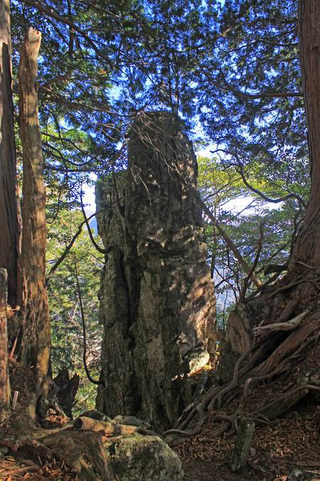 | 帰路に使う予定の閼伽坂尾根の分岐を過ぎたところに立つクリカラ岩。 ここまで来たら二ツ岩まであと少しです。 |