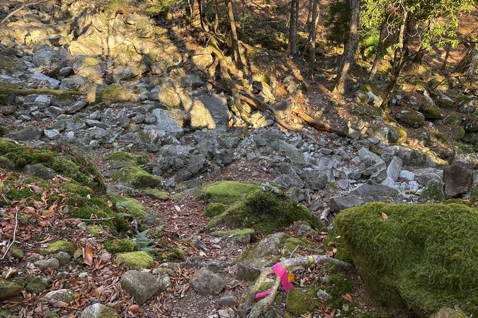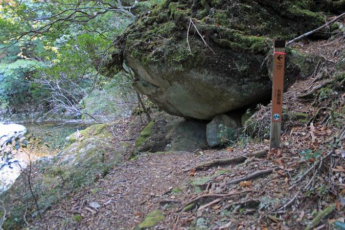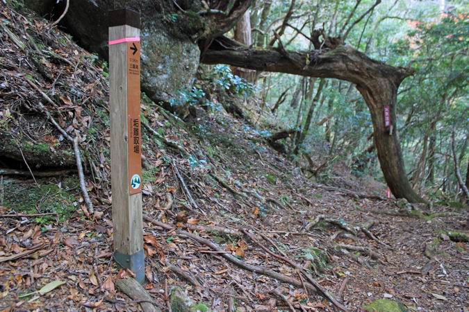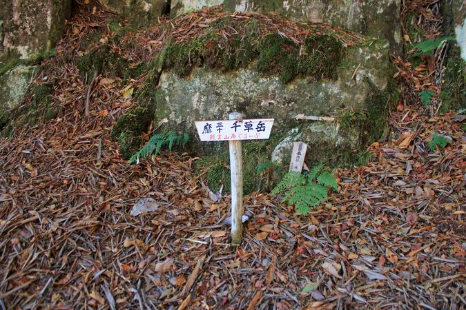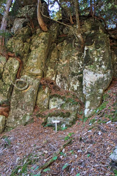 | 断続的に続く階段をゆっくり登って行くと、左手に巨岩が続くようになる。 未確認の靡の一つだった第30靡の千草岳はこの巨岩のあたりにあるらしい。 階段を登ったり下りたりして探していると少し遠くの岩の基部に立札みたいなものがあるのを発見。 |
