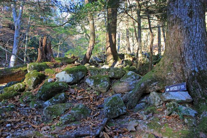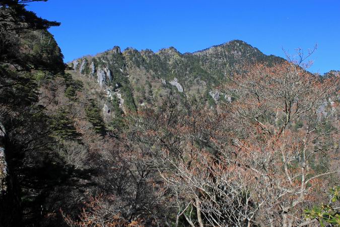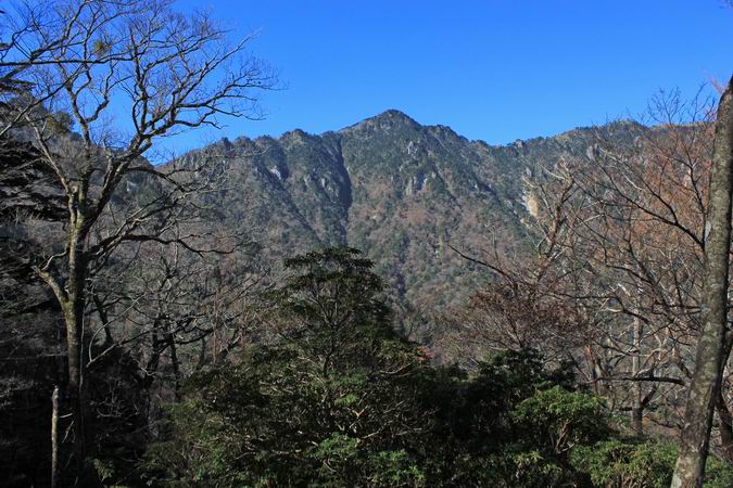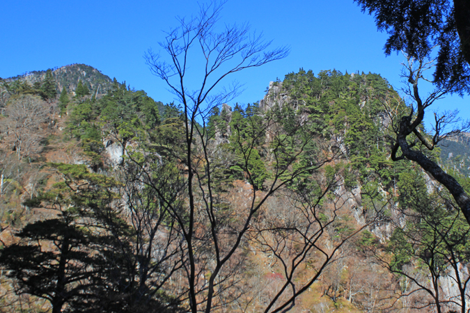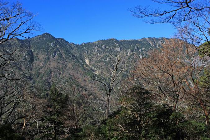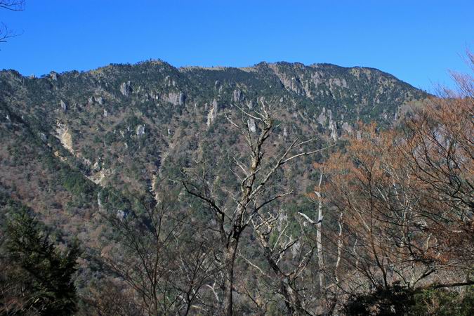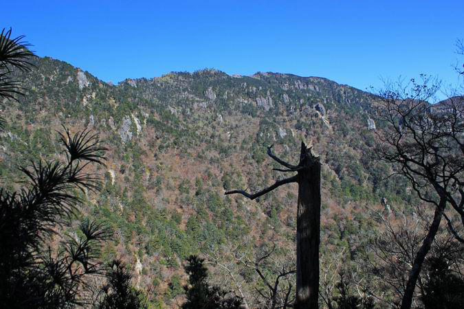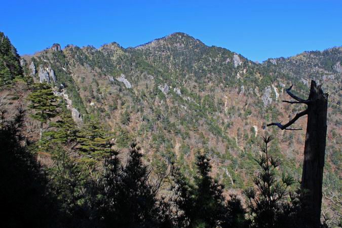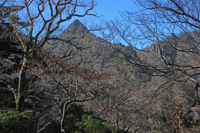 | 二ツ岩からの釈迦ヶ岳(左奥)と千手岳(手前中央)。 2006年11月撮影。 今は木が茂って二ツ岩からは見えなくなっていた。 |