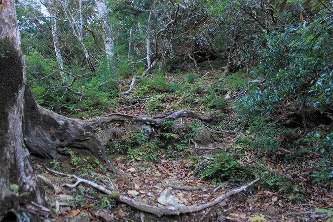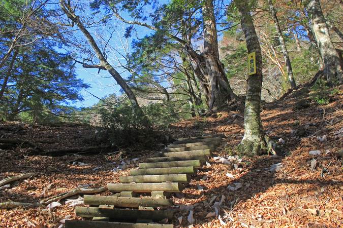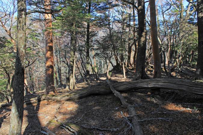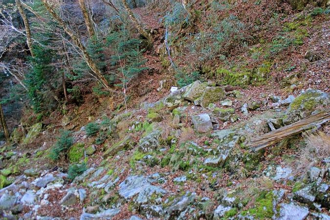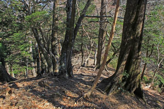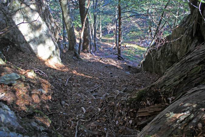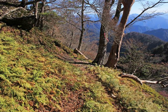 | 前鬼川に沿って斜面を巻きながら高度を上げて行きます。 南斜面になったのでこれまでと打って変わって午後の日差しが明るく、気分的にもホッとします。 |