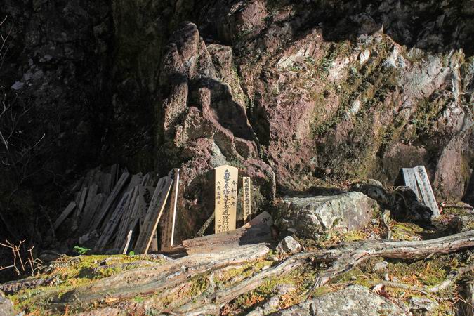 | 二ツ岩の基部に置かれた多数の碑伝 |