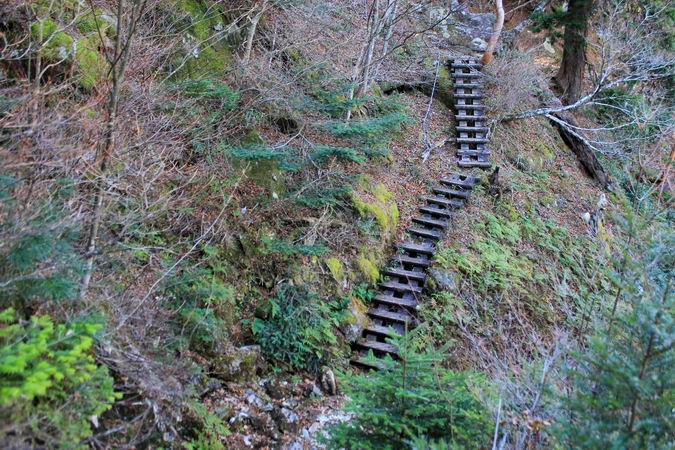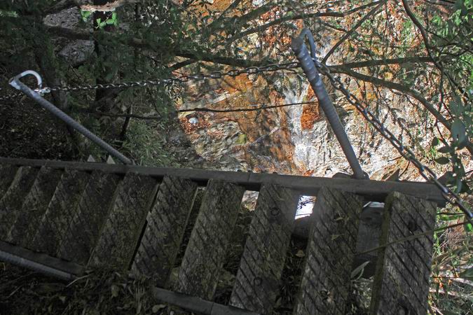 | さて、時間もないので最上部の馬頭滝方面は割愛して、少し休憩してから帰途につきます。 まずは鉄梯子が連続する登りです。足が上がりづらい。 |