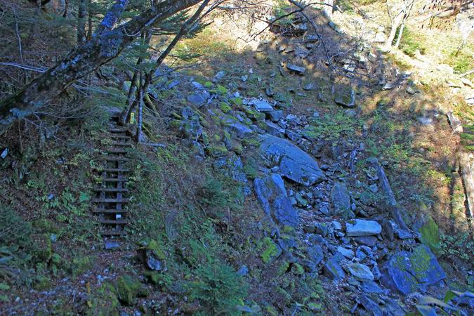 | その後小さな涸沢の上部を横断したあと階段が続く急登となります。 |