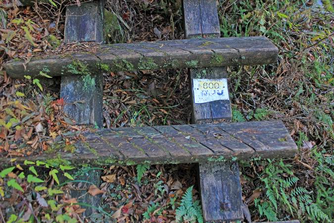 | 上の写真の階段の基部。600段目です。 千手岳へはこのあたりから取り付くようだが、まわりには手掛かりのようなものは見られなかった。 |