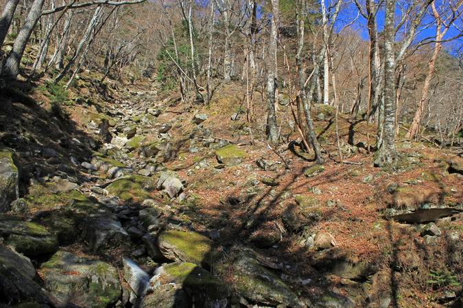 | 白い岩が転がる涸沢を渡って緩く登って行きます。 |