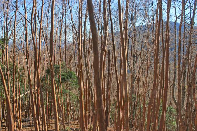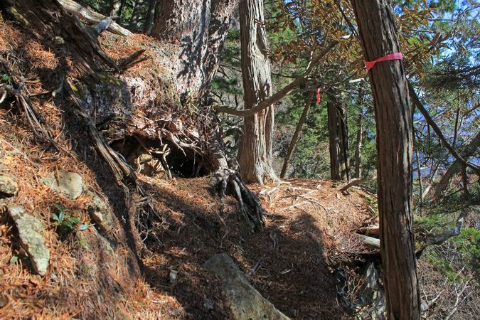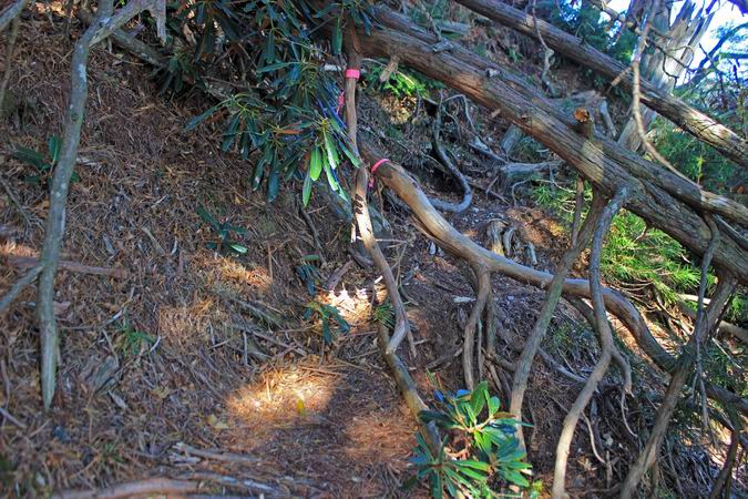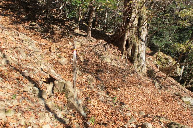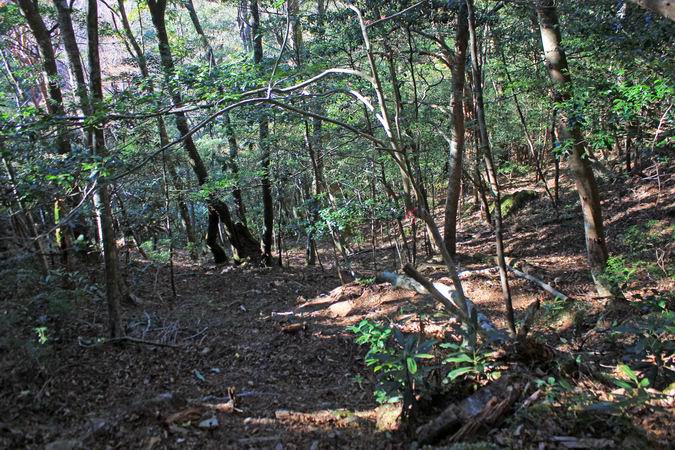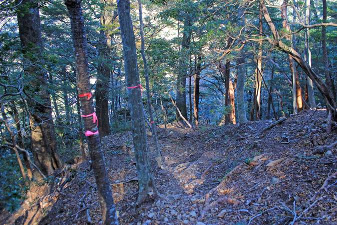 | 実際はそんな単純なことではなかったが、斜面の途中には明らかな踏み跡や赤いテープやリボンもあり、 季節柄、木々は落葉しているので見通しも良く、あまり不安感はなかった。 |