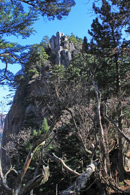 | 二ツ岩の裏に回り込んで孔雀岳の五百羅漢を眺める。 初めて釈迦ヶ岳に登って以来20年近くになるが、その間樹木が茂って眺望が悪くなってきている。 |
