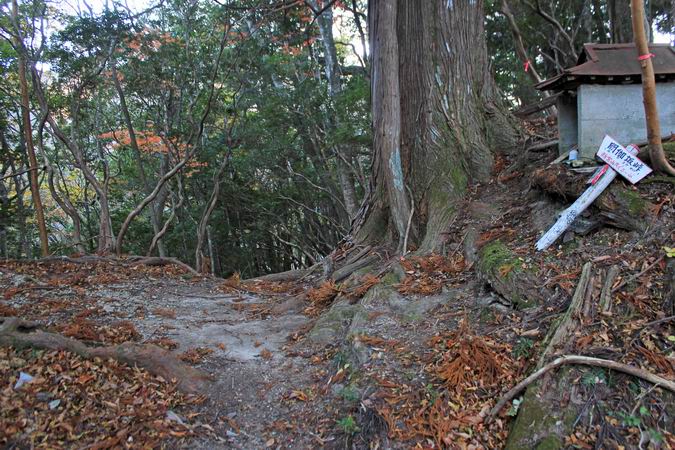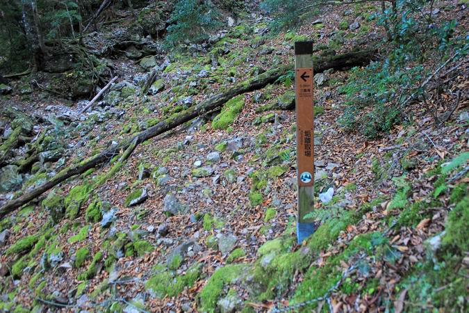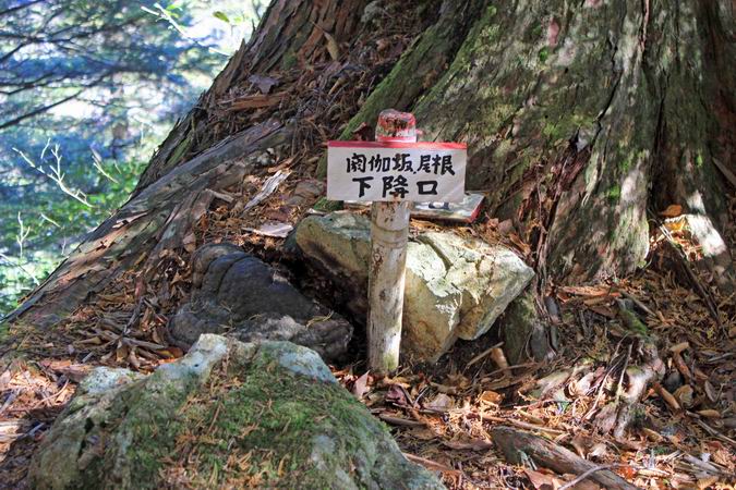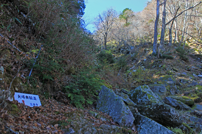 | 二ツ岩から少しで閼伽坂尾根の分岐。 ここから閼伽坂峠まで1時間、峠から垢離取場を経て三重滝までの往復を2時間半、峠から小仲坊まで30分 とすれば午後4時には小仲坊に戻ることができる。時間的にギリギリだが頑張ろう。 |